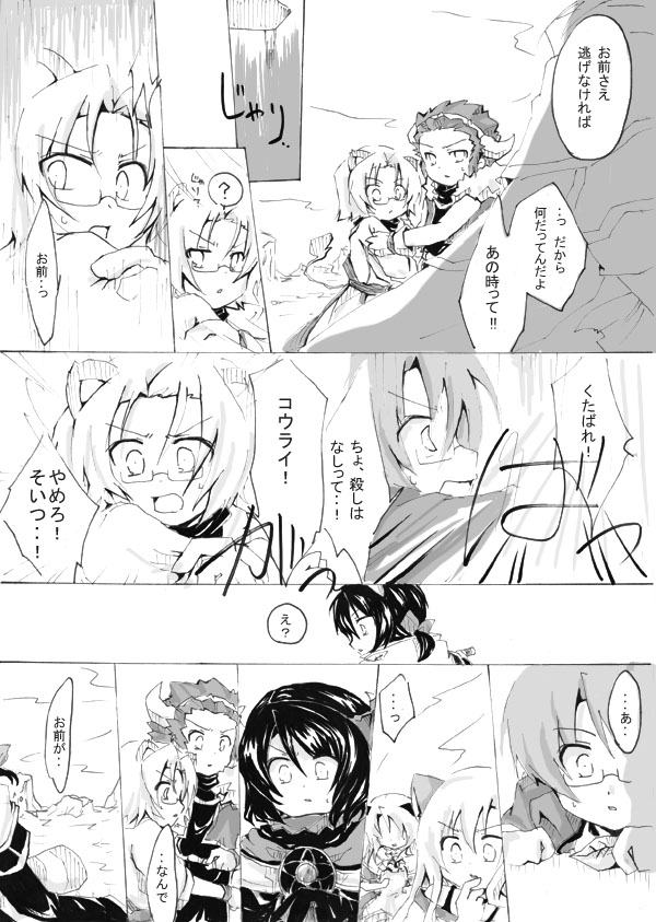 いくつか、誰のセリフか分からないですよねorz そして言い回しがくどい。 もはや人の多さと黒塗りの多さと話進めようという気負いで 描いてる自分がパニックです。 身長差がエライことになってるのは 勢いで描いたからです。すみません(土下座) いぇあー!!! 戻る